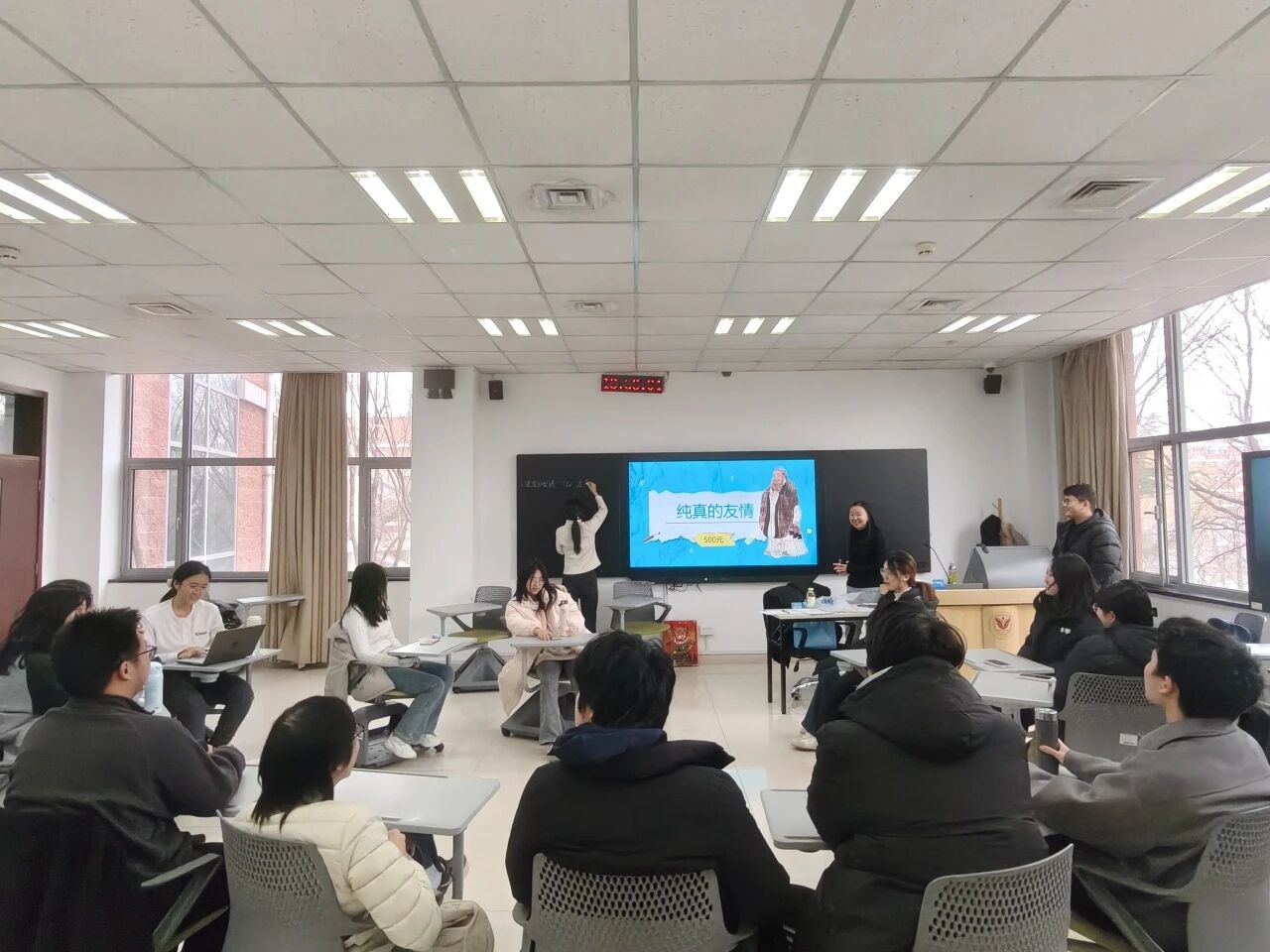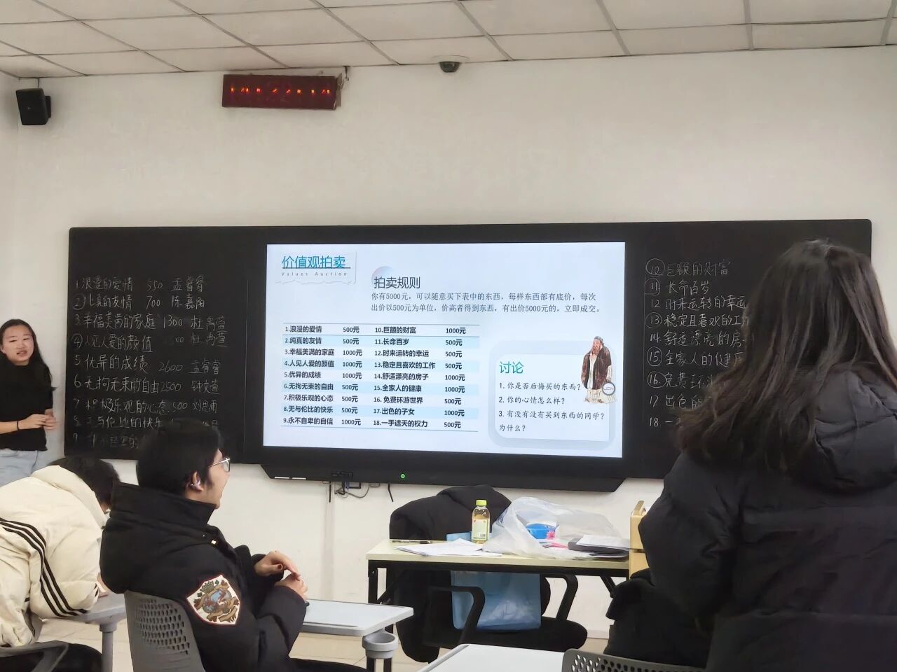 随后,一场别具一格的“价值观拍卖”游戏正式拉开帷幕,主持人首先介绍了“价值观拍卖”的规则。组员们手中持有等额的“人生筹码”,参与竞拍代表着“自主学习”“社会实践”“健康生活”“职业规划”等价值观念的“拍品”。有人毫不犹豫地竞拍“巨额的财富”,有人坚持不懈地为“优异的成绩”出价,也有人精心规划自己的“预算”,只为竞得“永不自卑的自信”。在热烈的举牌和欢快的笑声中,大家不仅尽情享受了游戏的乐趣,更在这一过程中探寻了自己内心的期待。一位选择了“巨额的财富”的同学在分享时表示,拥有了巨额的财富,不仅能获得其他拍品,还能拥有充足的资源和能力去帮助更多有需求的人,让人人都拥有财富。