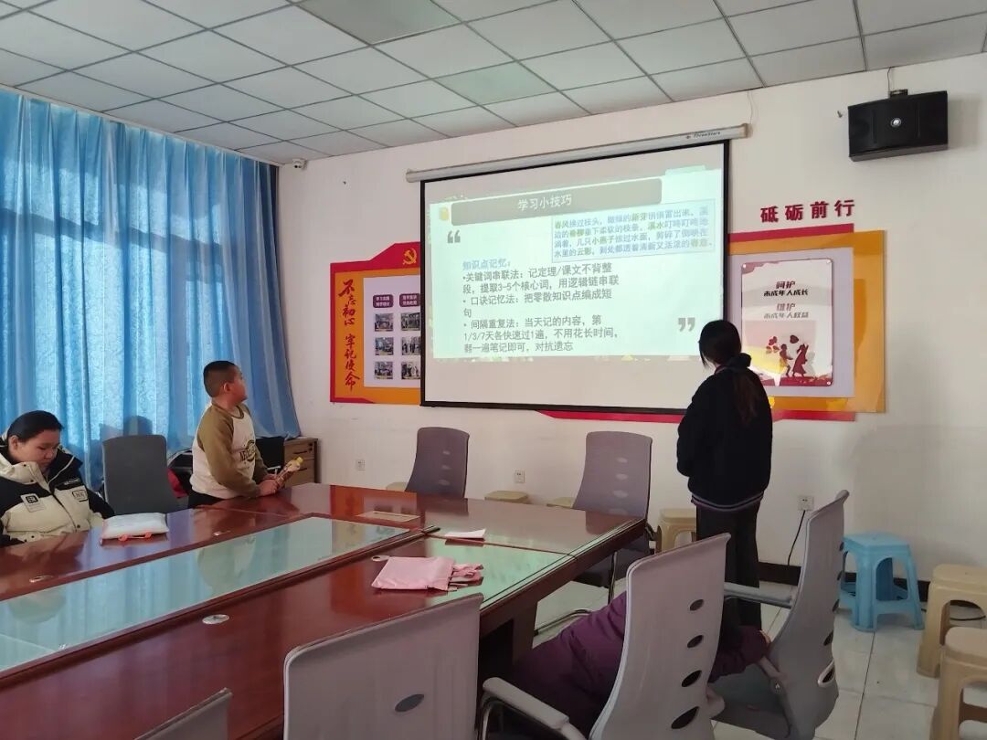 在了解基本情况后,社工为孩子们带来了一场实用的学习技巧分享。社工先以“纨绔子弟”“拍马屁”等有趣的小知识,激发孩子们的兴趣。随后,社工重点介绍了“关键词串联法”和“间隔重复法”两种记忆技巧,并以一段文字为例现场演示如何快速背诵。在社工的鼓励和提示下,一位小朋友主动尝试复述,过程中虽有几处小失误,但最终顺利完成了练习。此外,社工还分享了框架、符号、缩写和留白的笔记方法,并启发孩子们理解学习不是机械地记忆,而是主动地整理、思考和表达。分享的最后,社工以“少年应有鸿鹄志,当骑骏马踏平川”勉励孩子们好好学习,树立远大志向。