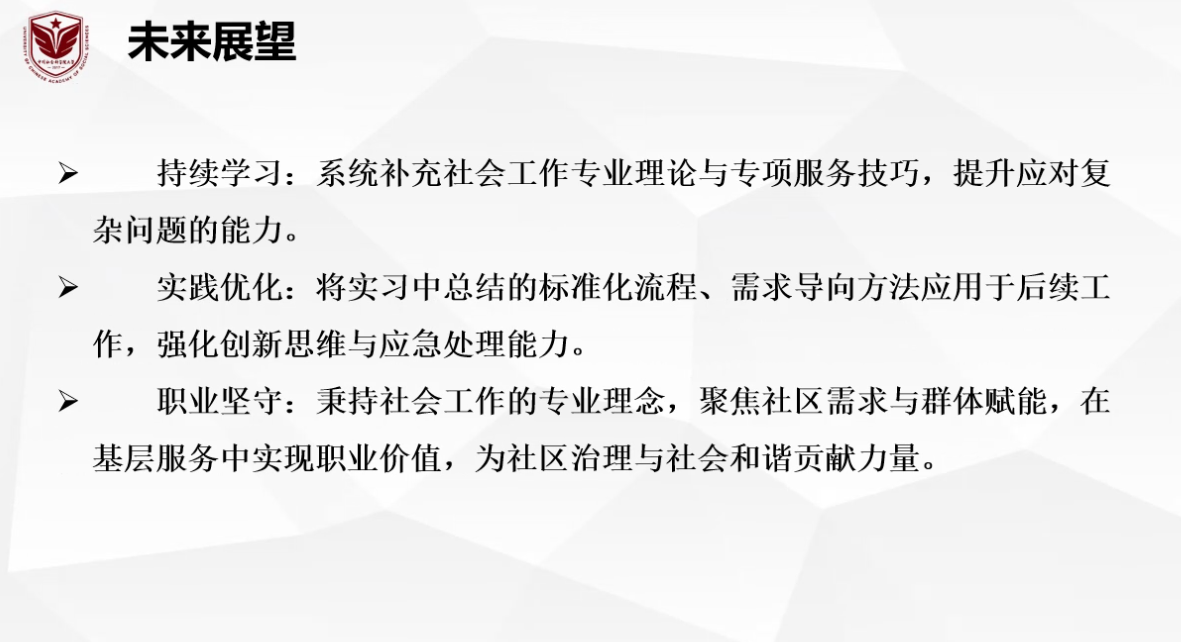 在本次实习汇报中,多位同学结合不同实习场域分享了实践收获:如刘娇娇同学赴新疆博湖县委社会工作部完成毕业实习,深度参与志愿服务与新兴领域党建相关工作,体会到在行政体系中坚持专业价值、强化资源整合与持续学习的重要性;周小梅同学在社会工作事务所聚焦司法社会工作与社区服务,参与涉罪未成年人社会调查、监护评估与社区活动等实践,同时就社工服务行政化、人才流失与本土化适配等行业议题提出反思;崔宇昕同学依托日本av